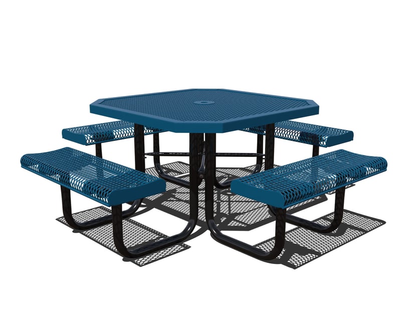 Our Rolled Octagon Portable Table is beatifully designed to be durable and comfortable. The tabletop and seats are made of durable rolled steel, which is coated with a thermoplastic finish. The rolled design creates a smooth, curved surface that is comfortable to sit on and easy to clean. The frame of the picnic table is made of sturdy galvanized steel tubing, which provides strength and stability while also protecting against rust and corrosion. The frame is designed with a cross-legged style that allows for easy access to the seats and creates a stable base for the table. With its rolled metal design, this heavy duty picnic table has an appealing look designed to fit within any location.