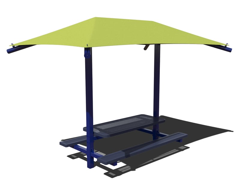 From parks to college campuses, the table with integrated shade is a great amenity for any location. It provides relaxing seating with the comfort of shade. It features our 6-foot regal table with 8-foot seats and our 12.5' x 8' shade.